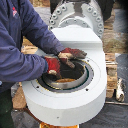 Auf den Fotos, welche die Vorbereitungen zu einem kompletten Austausch der Gelenklager zeigen, wird ein weiteres Fett aufgebracht. Dieses dient zur Montage des Gleitlagers, zur Abdichtung der Spalten zwischen den vorgeschalteten Dichtungseinheiten und zur Fettung des Innenbereich der Gehäuse, in die dann die Gleitlager eingepresst werden. – Es handelt sich bei dem eingesetzten Fett um Lanolin, ein natürlicher Wollwachs, der aus Schafshaaren gewonnen wird.