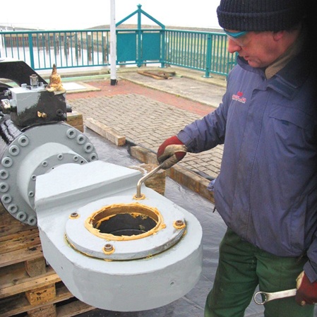 Die Schleuse vor Ort arbeitet mit einer zentralen Schmierstoffversorgung für die Gelenklager. Es wird der spezielle Schmierstoff „PANOLIN“ eingesetzt, der biologisch abbaubar ist und nicht toxisch. Bei jedem Bewegungsvorgang, wo die Zylinder hart arbeiten müssen, wird mit der zentralen Schmierstoffanlage nachgeschmiert. Somit ist gewährleistet, dass die Lager nicht trocken laufen.