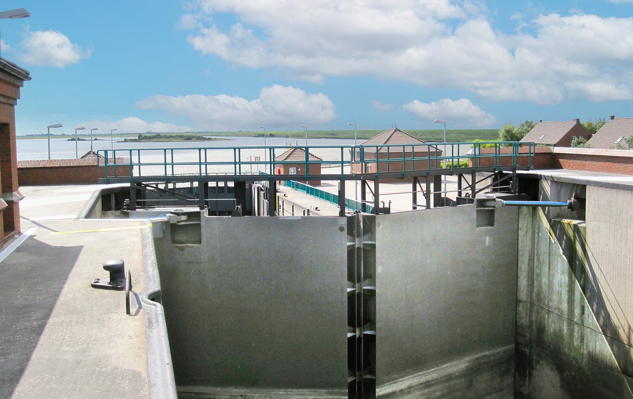 Das Sperrwerk besitzt im Mündungsbereich einen Schutzhafen von 170 m Länge und 100 m Breite mit einer durchgehenden Sohlsicherung. Es wurde außerdem noch ein 60 m langer Notanleger als Kaianlage gebaut. Die Seeschleuse hat eine Schleusenkammerlänge von 80 x 14 m, eine lichte Durchfahrtsweite von 14 m, wobei sechs Kutter oder 20 Sportboote gleichzeitig geschleust werden können.